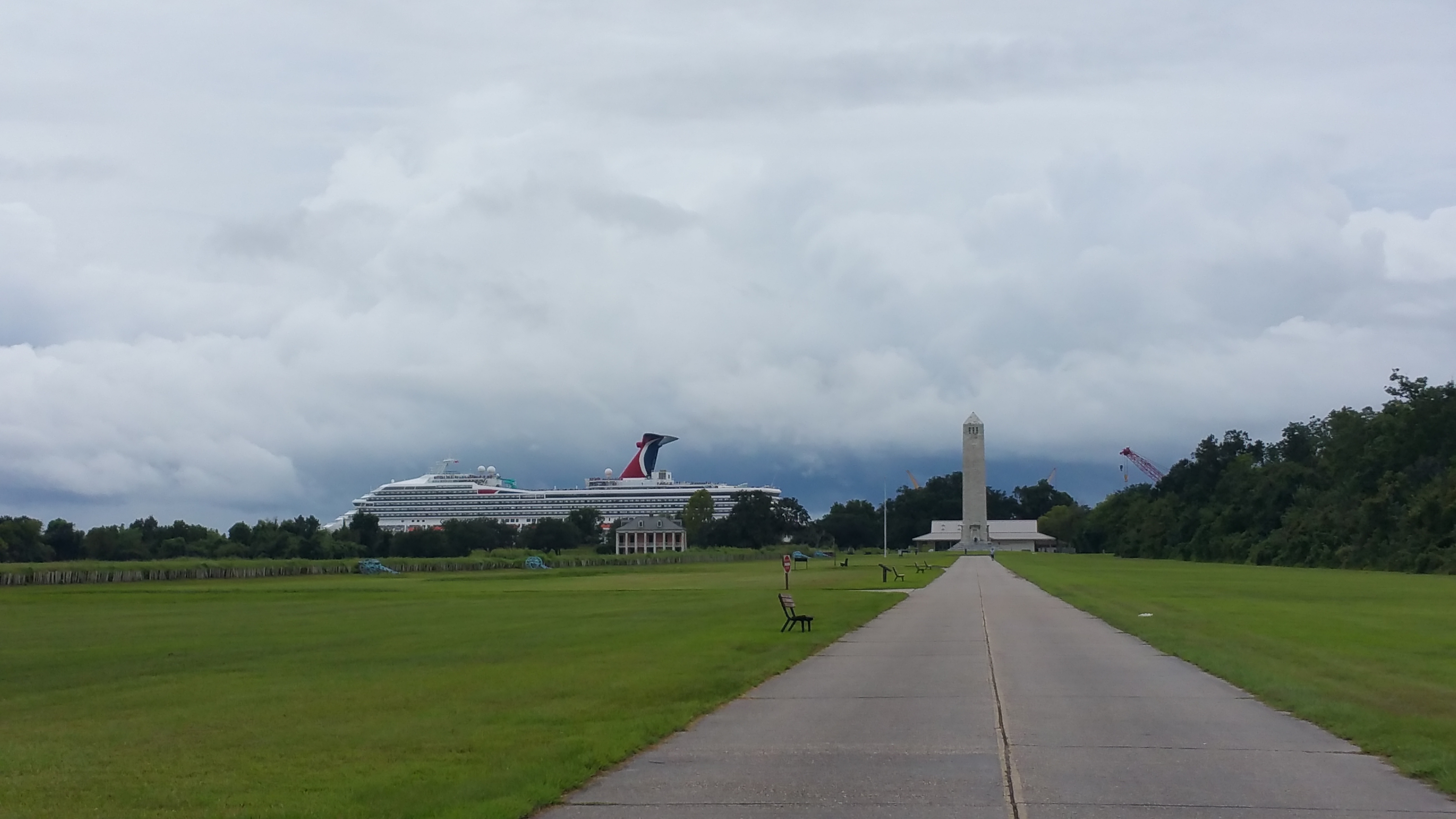 A cruise ship transits down the Mississippi River, just behind the Chalmette Battlefield Historic Site.