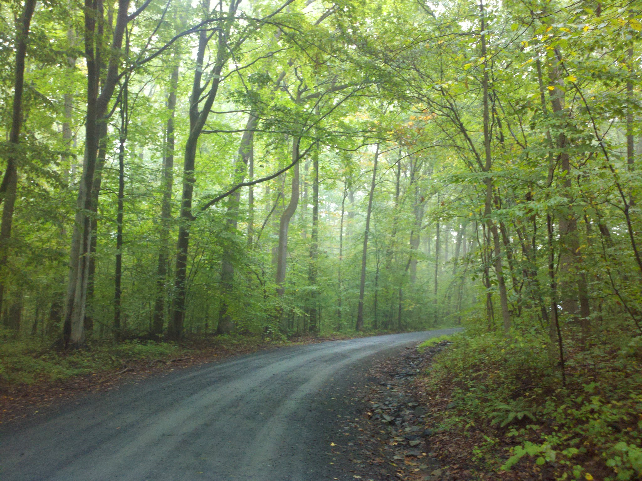 An unpaved road travels through a densely wooded area in Harford County, MD, USA